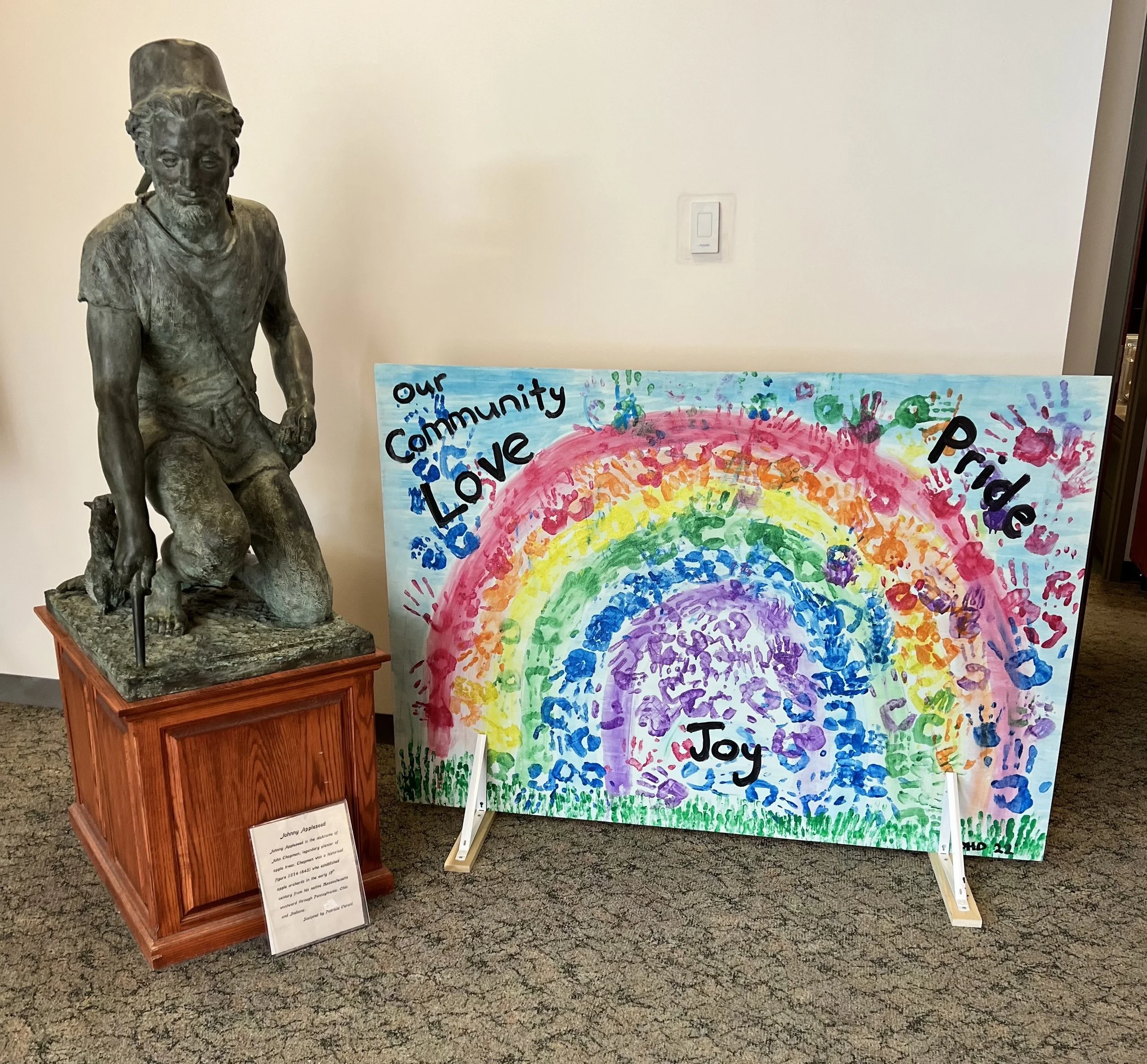 Our space offered free mini rainbow totes and pins, flags, temporary tattoos, a photo booth, raffle, and a community art project which is now on display at Leach Library.
